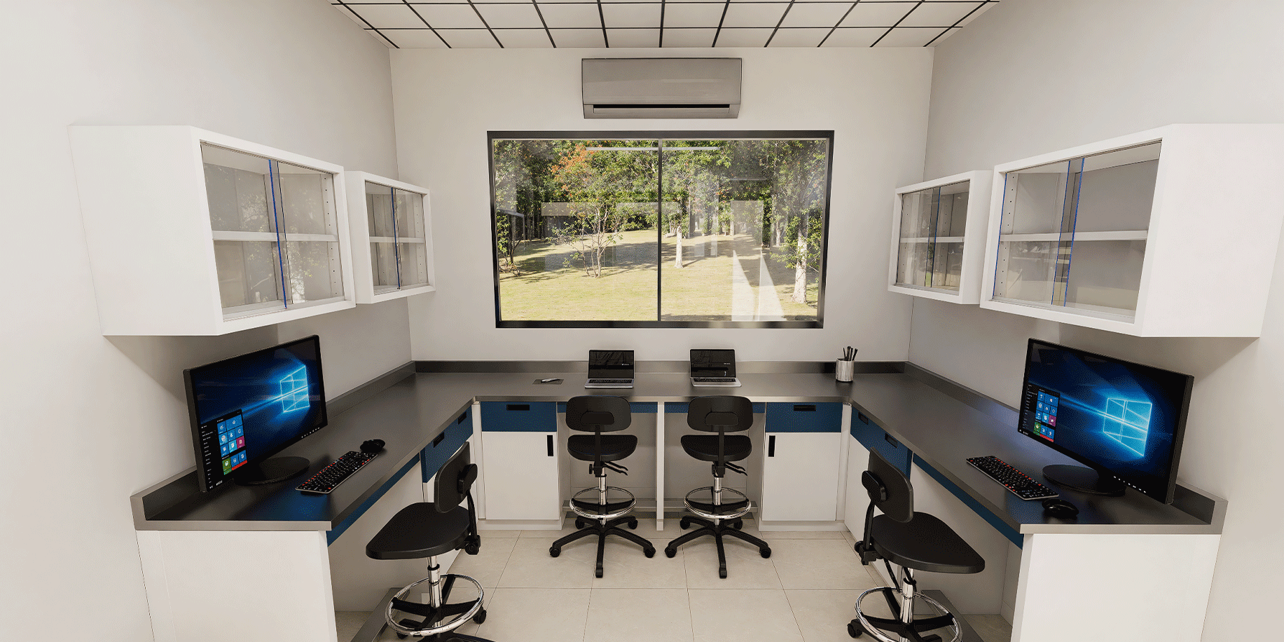 Laboratorio clínico Torre Roja, cubiertas acero inoxidable, frentes superiores guinda, frentes inferiores y gabinetes gris glaciar.
