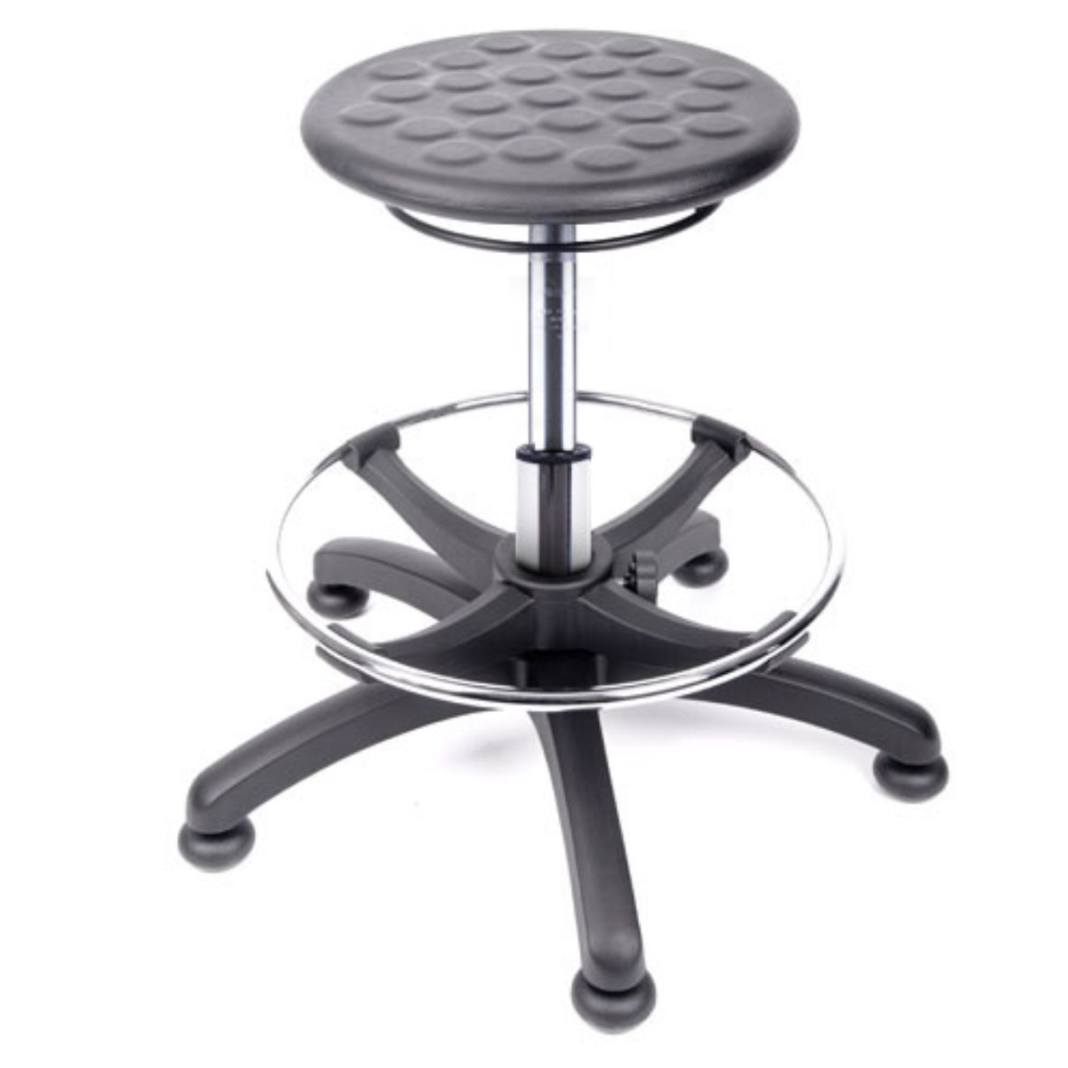 Banco giratorio, asiento redondo de poliuretano piel integral, mecanismo de ajuste neumático de altura, base de 5 anclas con regatones o rodajas, aro descansapies ajustable.