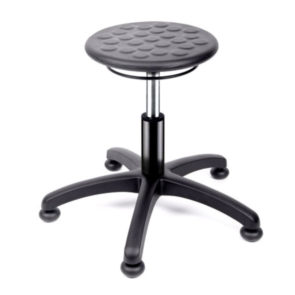 Banco giratorio, asiento redondo de poliuretano piel integral, mecanismo de ajuste neumático de altura, base de 5 anclas con regatones o rodajas.