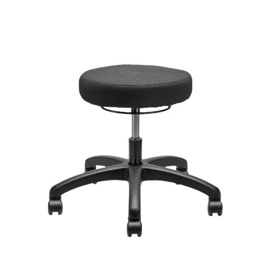 Banco giratorio, asiento redondo de espuma de poliuretano tapizado, mecanismo de ajuste neumático de altura, base de 5 anclas con regatones o rodajas.