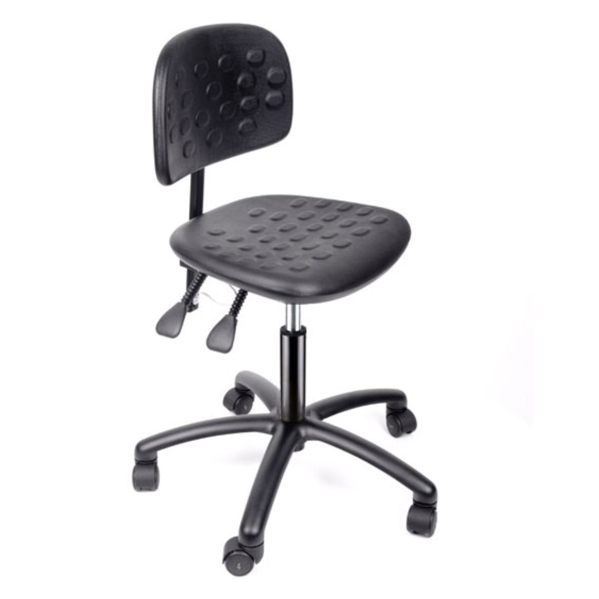 Silla giratoria, respaldo y asiento moldeados de poliuterano piel integral, mecanismo de reclinación de respaldo, ajuste neumático de altura; base de 5 anclas con regatones o rodajas.