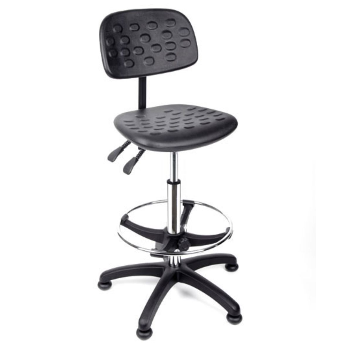 Silla giratoria, respaldo y asiento moldeados de poliuretano piel integral, mecanismo de reclinación de respaldo, ajuste neumático de altura; base de 5 anclas con regatones o rodajas, aro descansapies.