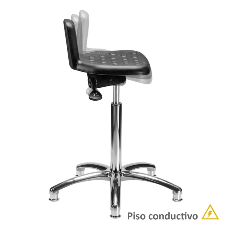 Banco giratorio, asiento de poliuretano piel integral, mecanismo de reclinación de asiento, ajuste neumático de altura, base de 5 anclas con regatones, piso conductivo.