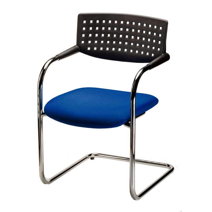 Silla visita, respaldo de polipropileno, acojinado de asiento de espuma de poliuretano, coderas integradas de polipropileno, base tubular cromada de 1″ Ø calibre 12, peso neto de la silla 9.5kg