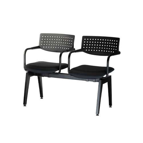 Banca 2 plazas, respaldo de polipropileno flexible de alta resistencia, acojinado de asiento de espuma de poliuretano, tapizado, coderas integradas de polipropileno, largueros de ptr, base estructura de acero, en negro, regatones ajustables