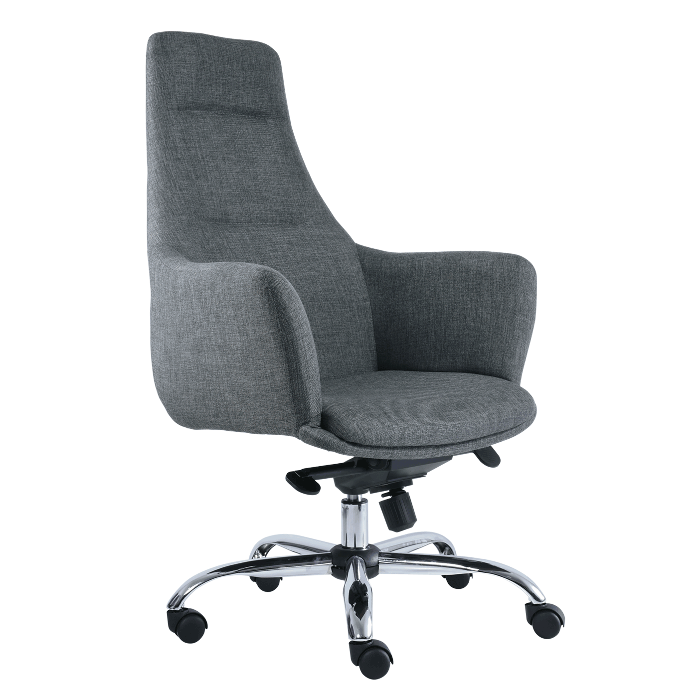 ejecutivo alto fabricado en estructura tipo concha con brazos, base cromada , mecanismos de rodilla syncro con 5 posiciones de bloqueo. tapizado