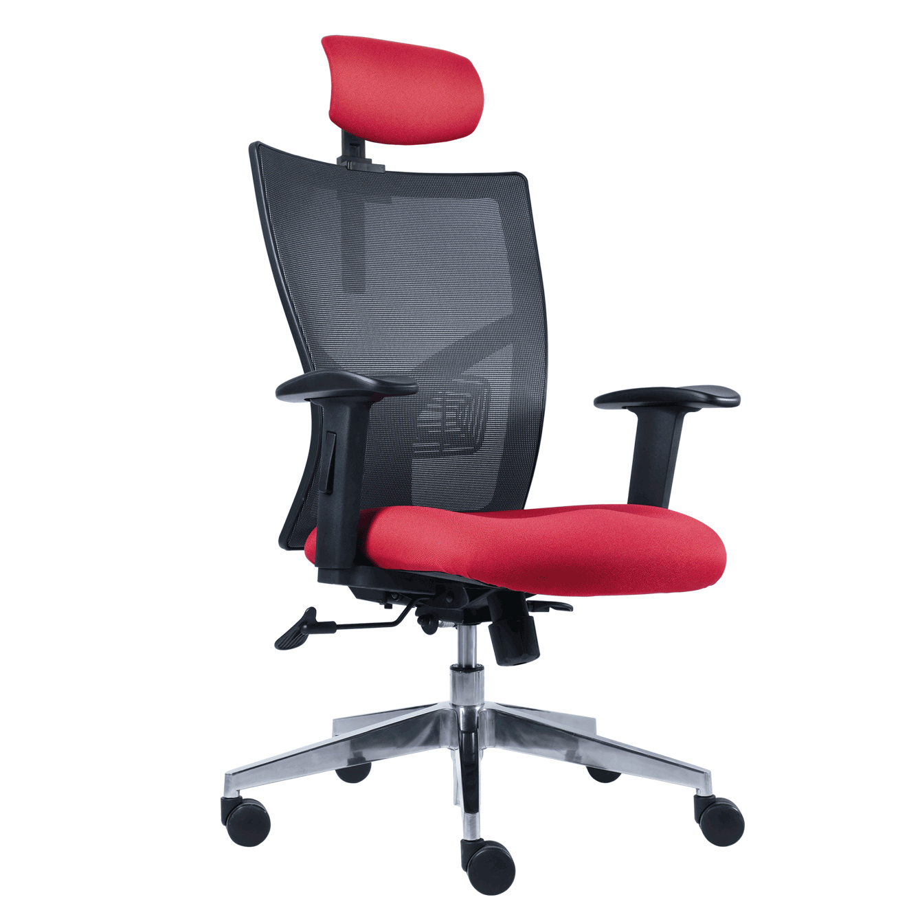 sillón operativo de respaldo medio con cabecera , respaldo tapizado en malla Flex o malla heavy Flex, opcional en 4 colores, soporte lumbar, asiento en poliuretano inyectado y tapizado en tela, brazos ajustables de gel con poliuretano, mecanismo syncro de dos palancas con bloqueo, base de aluminio con rodajas de 60 mm