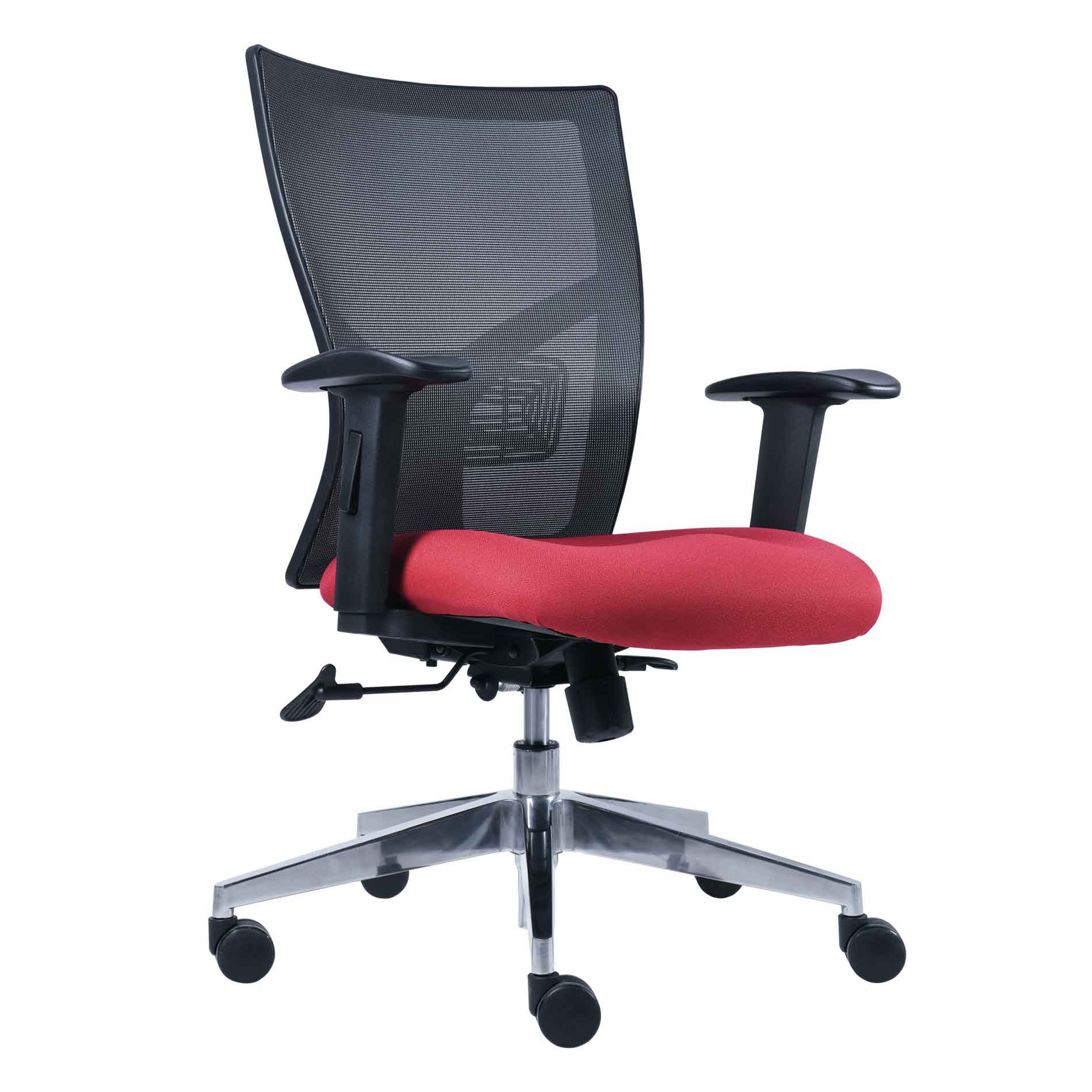 sillón operativo de respaldo medio, respaldo tapizado en malla Flex o malla heavy Flex, opcional en 4 colores, soporte lumbar, asiento en poliuretano inyectado y tapizado en tela, brazos ajustables de gel con poliuretano, mecanismo syncro de dos palancas con bloqueo, base de aluminio con rodajas de 60 mm