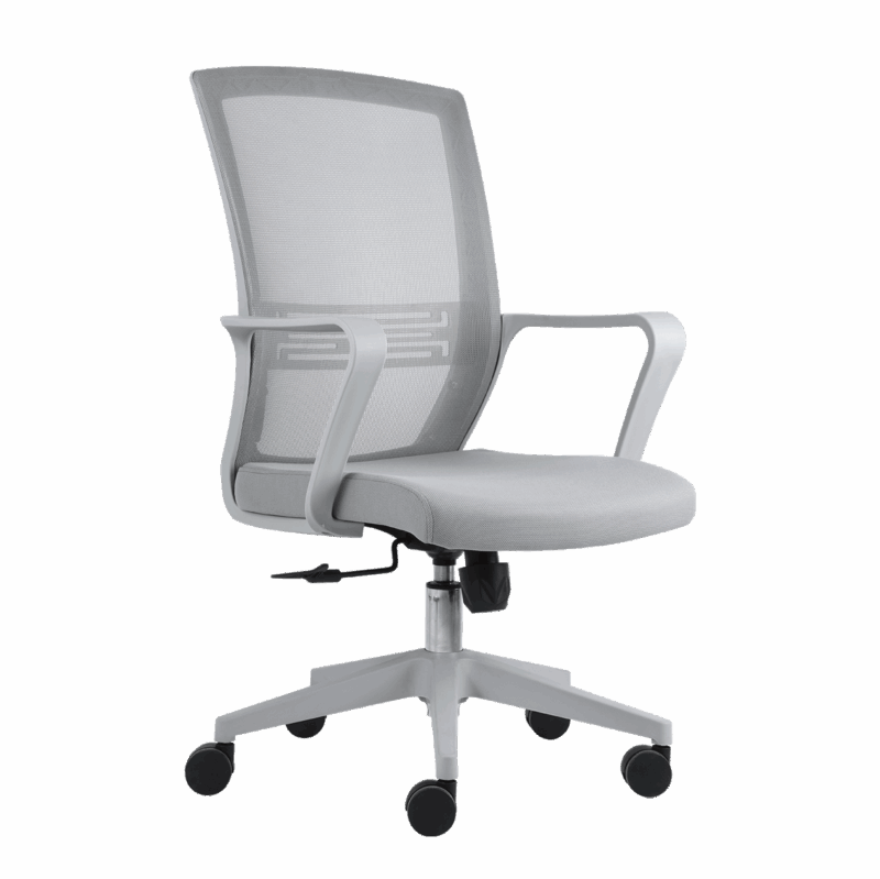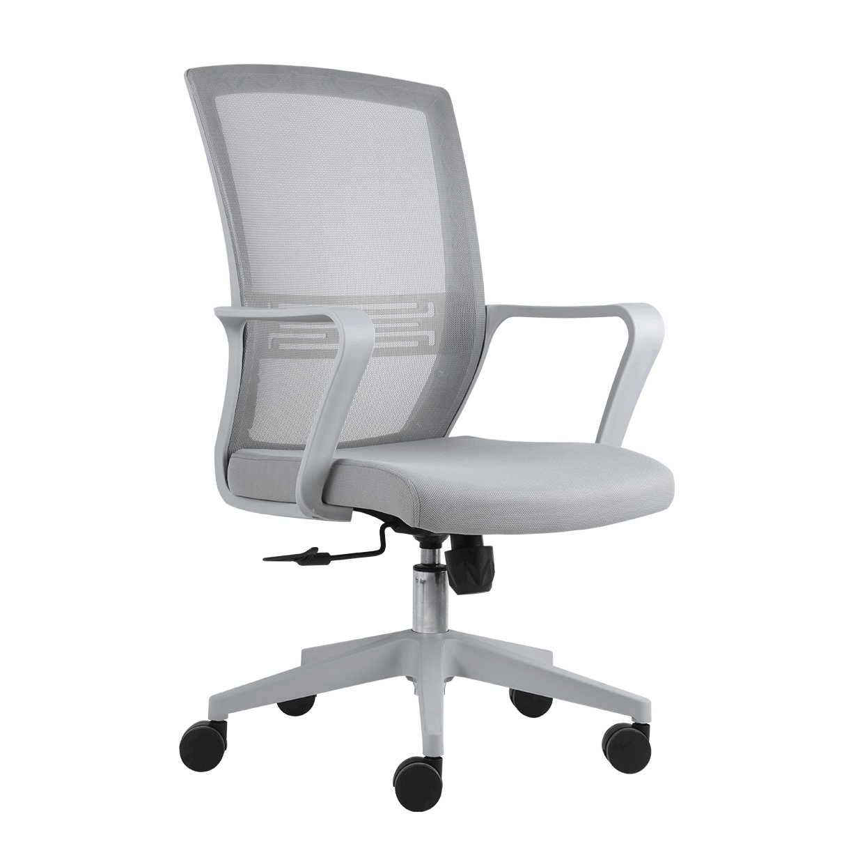 sillón operativo de respaldo medio , estructura color gris , malla color gris, asiento tapizado en tela color gris, base tipo piramidal de nylon, brazos en color gris , mecanismos ejecutivo reclinable con bloqueo 3 POR CAJA