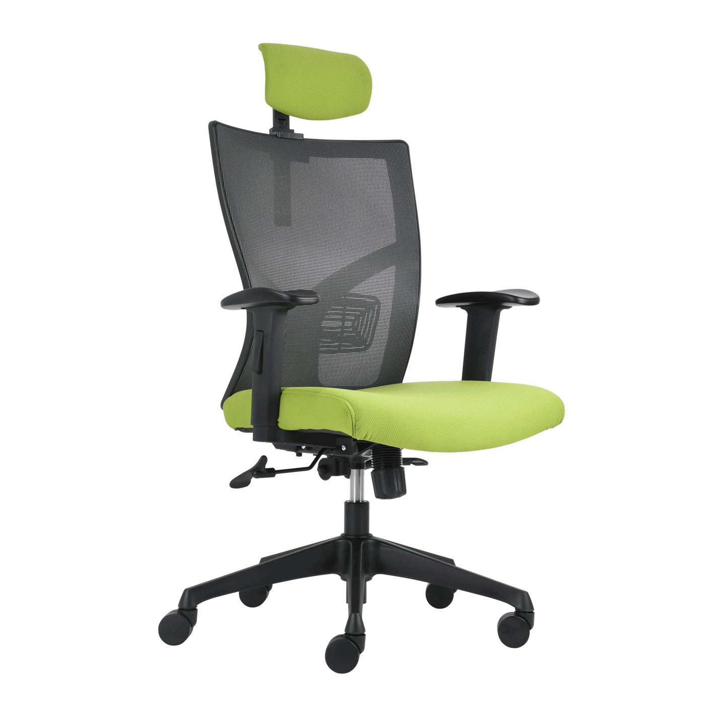 sillón ejecutivo de respaldo alto con cabecera , respaldo tapizado en malla Flex, asiento tapizado en tela, brazos ajustables de poliuretano, mecanismo syncro de doble palanca, base piramidal de nylon color negro