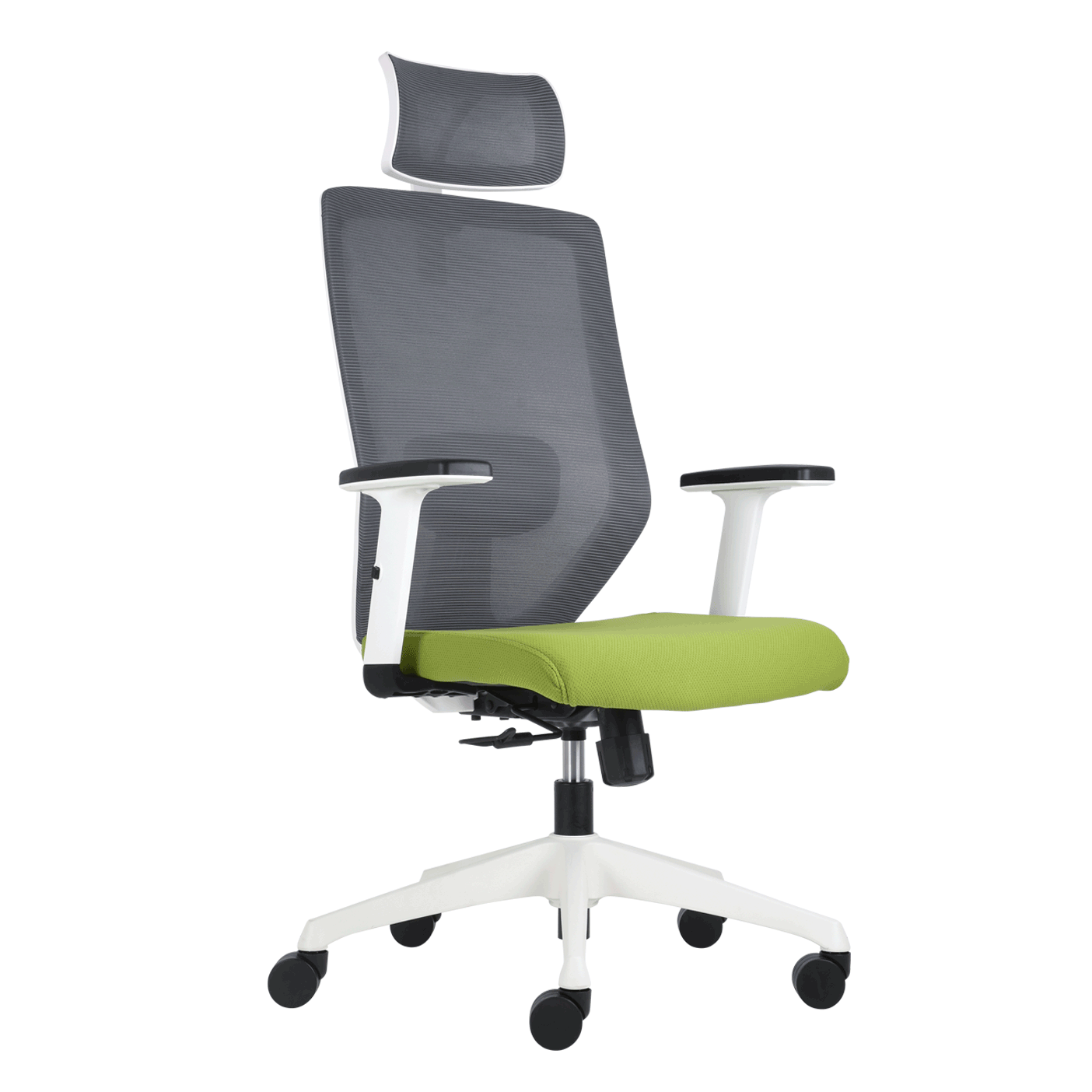 sillón operativo de respaldo alto con cabecera, estructura fabricada en color blanco, mecanismo syncro de dos palancas , para ajuste de altura y bloqueo , brazos en color blanco con pad en color negro, base de 5 puntas en color blanco con rodajas de 60 mm en color negro , respaldo tapizado en malla y asiento tapizado en tela