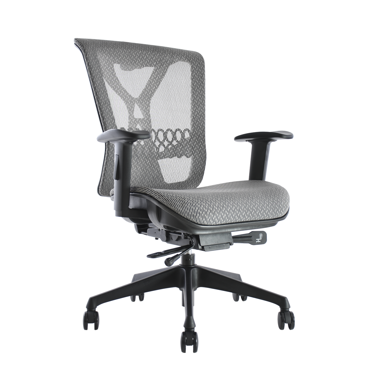 sillón ejecutivo de respaldo alto tapizado con malla Flex en respaldo y asiento , mecanismo syncro autorregulable con cuatro posiciones de bloqueo y ajuste de profundidad de asiento, brazos con ajuste de altura, base de nylon con rodajas de 60 mm color negro