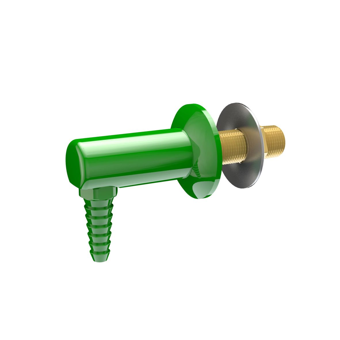 Cuerpo montado en cubierta o panel con extremo de manguera dentada antisalpicaduras de 90 grados. 2-1 / 8 ʺ desde el panel hasta el extremo de la manguera. Equipado con vástago de montaje, contratuerca y arandela de entrada macho NPT de 3/8ʺ.
