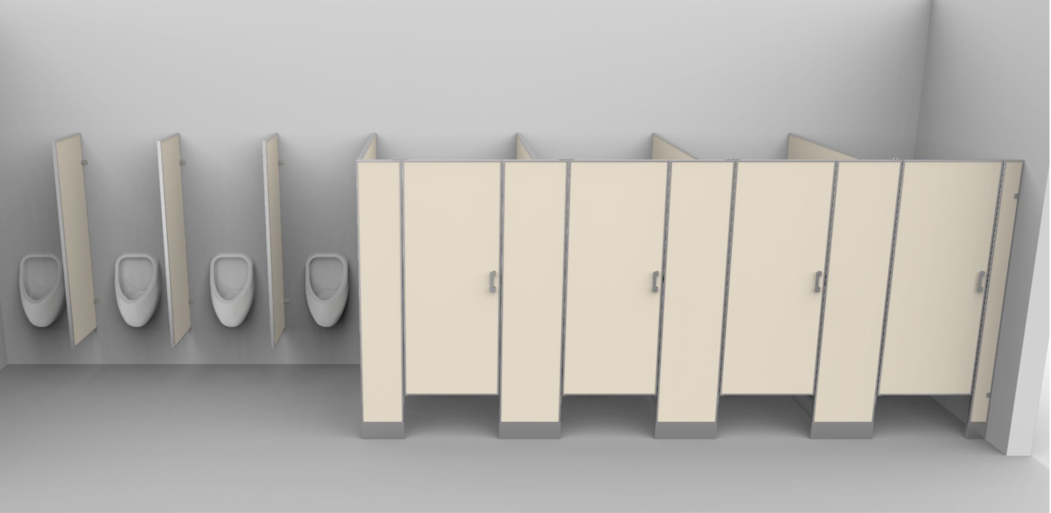 4 divisiones 392cm frente 150cm fondo, 3 divisiones para mingitorio, pilastras, puertas y herrajes